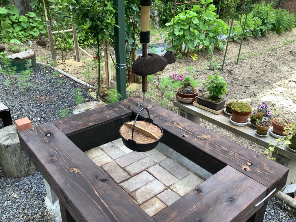屋外に設置したかまどでご飯を炊き。囲炉裏では収穫した野菜を使ったカレーづくりを体験します。